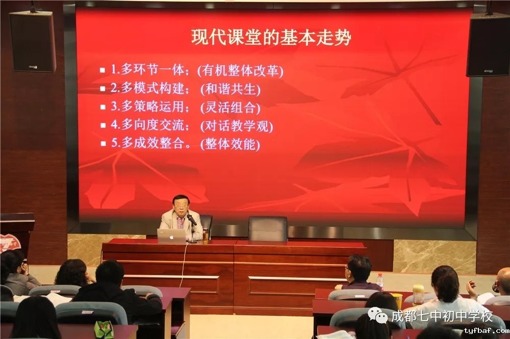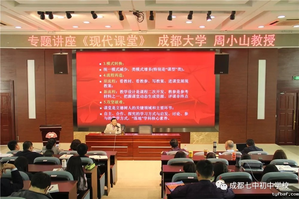 暮春四月,清和细雨乍晴,桃红柳绿荫长,七初校园里满目欣欣向荣。2019年4月16日,为将核心素养教育落到实处,优米app账号邀请到四川省教育厅中小学教师继续教育首席专家、成都大学周小山教授在学术一厅为全校老师开展了一次精彩纷呈的《现代课堂》专题讲座。