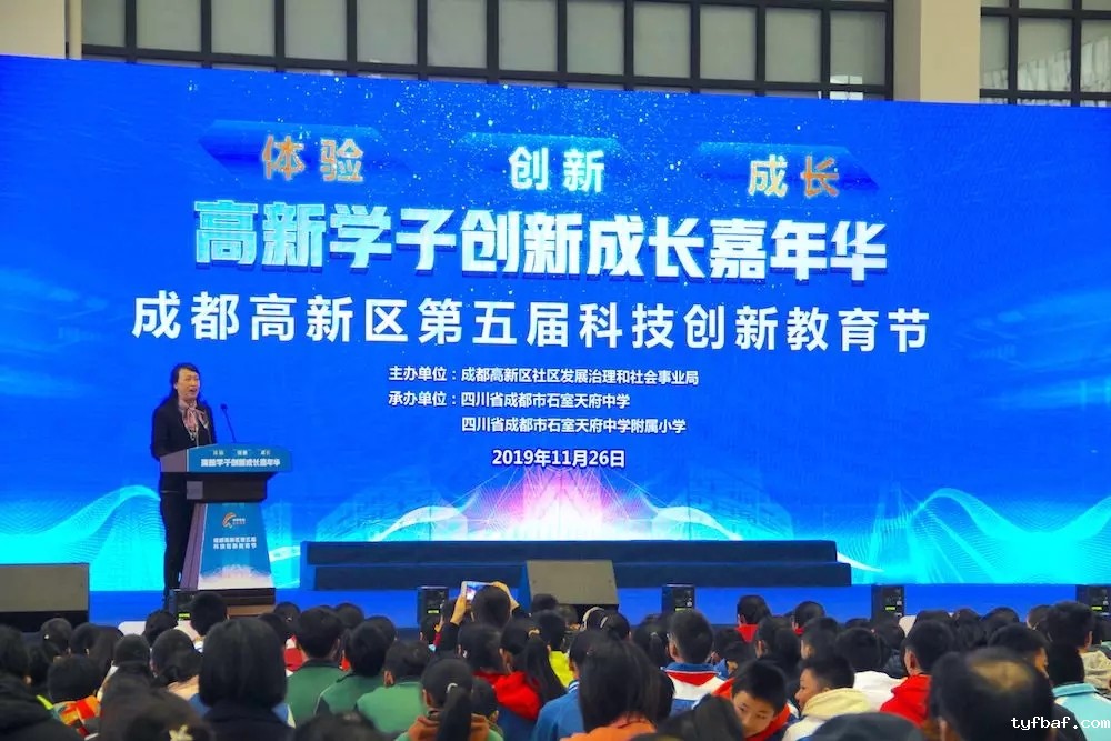 11月26日,由成都高新区社区发展治理和社会事业局主办的“高新学子创新成长嘉年华——成都高新区第五届科技创新教育节”在石室天府中学附属小学盛大启幕。本届科技创新教育节以“创新、体验、成长”为主题,旨在为高新区内各学校和学生搭建科技创新体验和学习交流的平台。来自四川大学、中国科学院成都分院、四川省教科院、成都市教育局、成都市科协、成都市教科院,高新区党群工作部、财政金融局等领导和专家,以及高新区各中小学师生代表和家长代表共千余人参与了本次盛会。