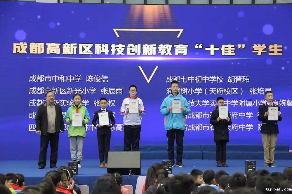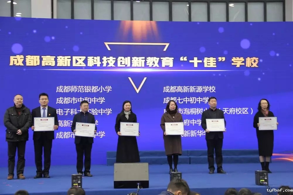 本次科技创新教育节还评选出了2018-2019学年度在科技创新方面表现突出的10所学校、10名教师和10名学生分别授予“高新区科技创新十佳学校”、“高新区科技创新十佳教师”以及“高新区科技创新十佳学生”荣誉称号。我校十分荣幸被评为了2018-2019学年度科技创新十佳学校,郭建老师被评为2018-2019学年度科技创新十佳教师,2020届6班胡晋玮同学被评为2018-2019学年度科技创新十佳学生。在开幕式上,李笑非校长代表学校上台领奖。