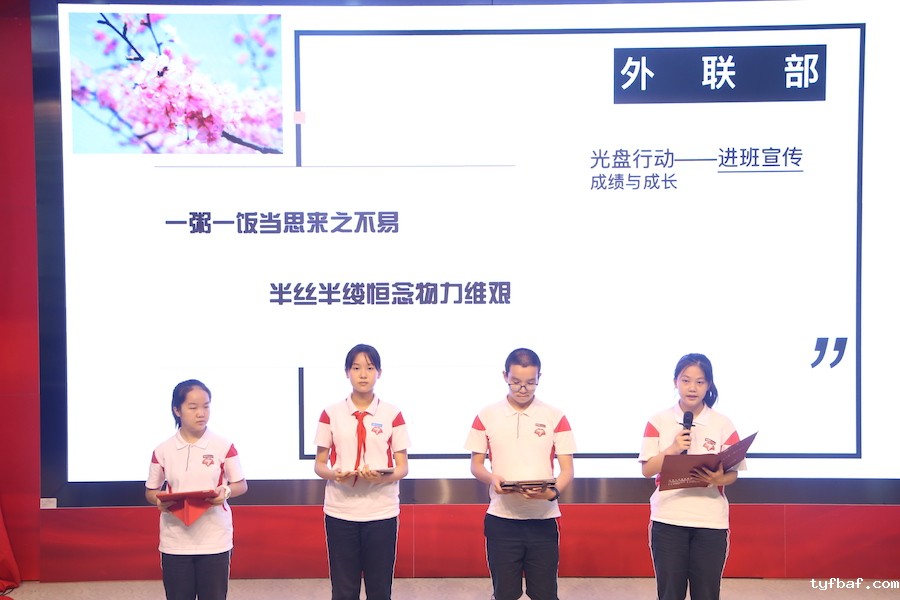 社团联合会主席蒋沛言、外联部部长焦思语、宣传部部长邓皓文和社联初一成员代表符芳萍对社团联合会本学期的工作进行了总结汇报。首先,他们分部门总结了社联在光盘行动宣传、志愿者服务、常规检查、例会分享等方面的工作情况,提出了工作中的问题,并给出了改进建议。接着,他们通过一段视频回顾了本学期社联特别的招新活动,并请初一成员代表分享一年里的机会与历练、成长与感悟。最后,社联主席提出了对社联后期的展望,希望新一届的社联同学们可以有担当,有责任感,引领社联走向更好的未来!