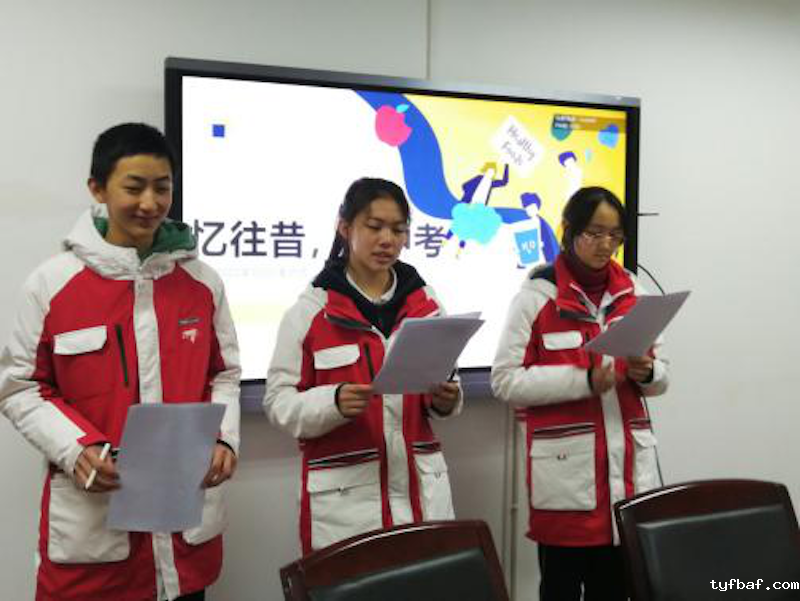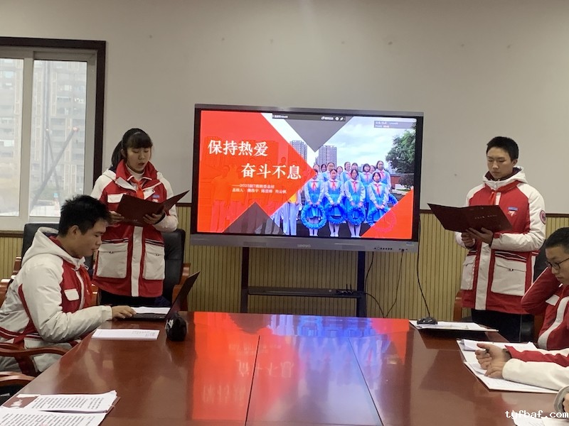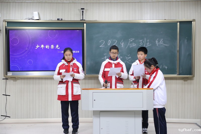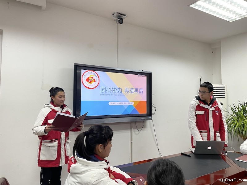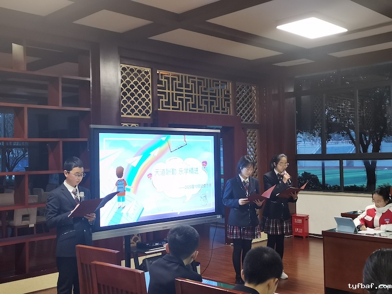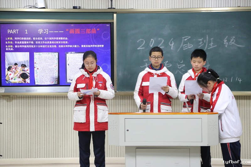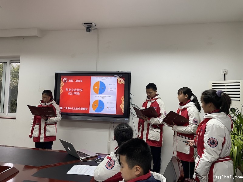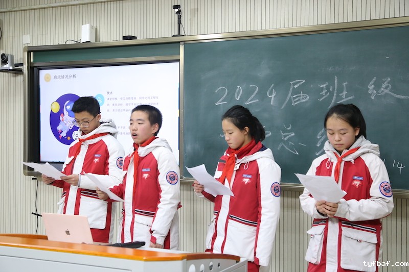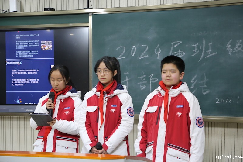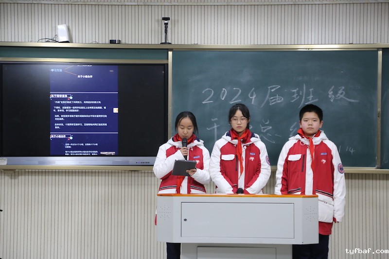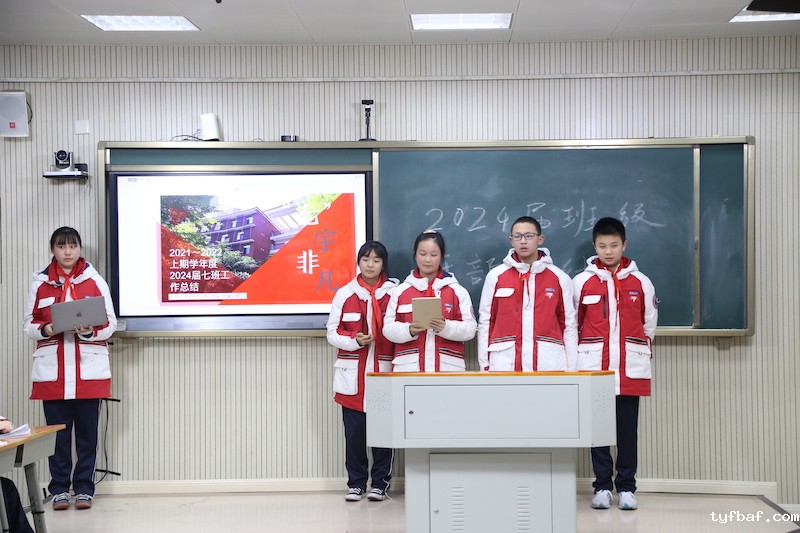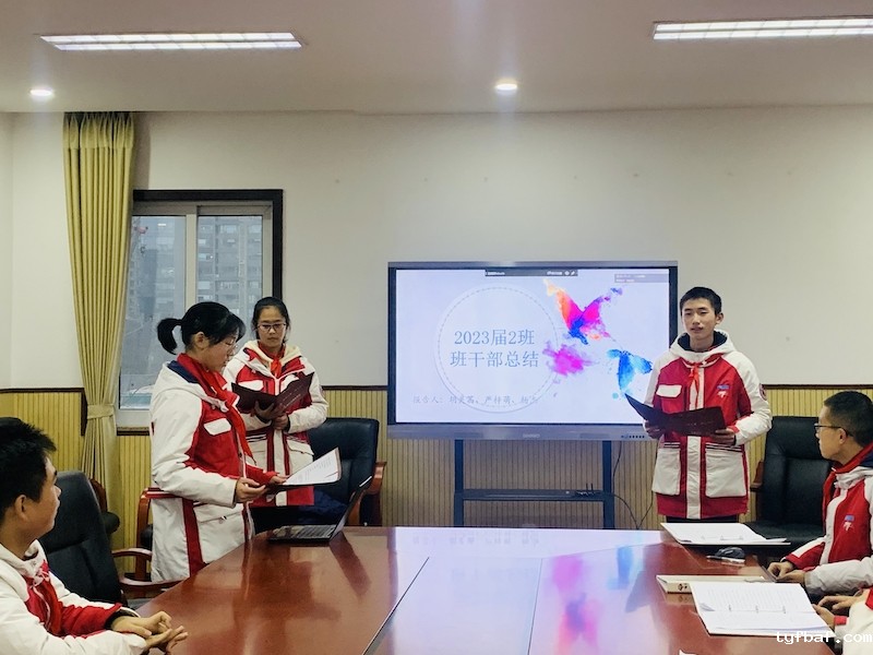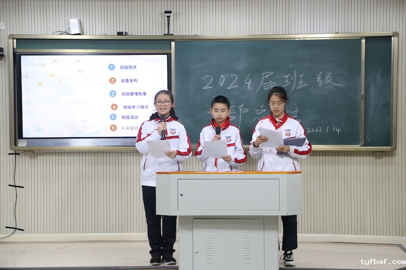 1班班委以“因材施教、团结共进、科学管理”为主题作总结报告,“因材施教,科学管理,团结共进”是班级管理的亮点。