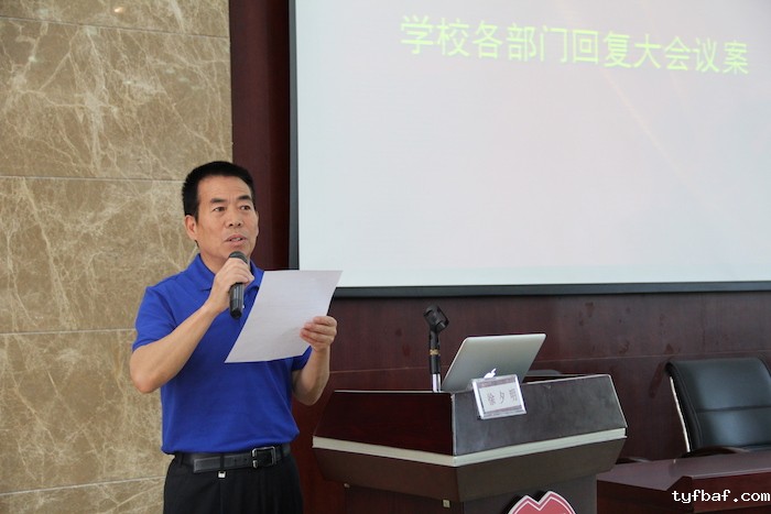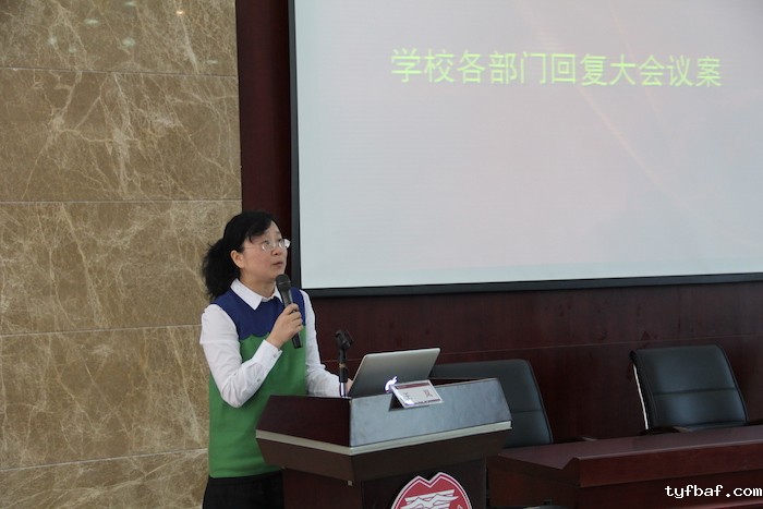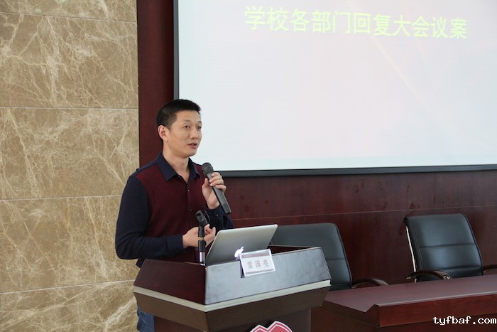 会议首先由教学管理部、行政后勤部、学生工作部的主任王岚老师、徐夕明老师、雷国亮老师对第一次会议的相关提案给予了高度评价并进行认真回复。