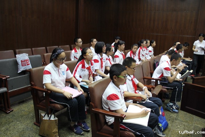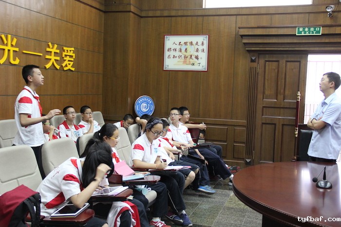 在法官的带领下,同学们参观了少年家事法庭。这是为化解家庭矛盾纠纷,维护未成年人合法权益,助力青少年健康成长而专门设立的法庭。随后,同学们旁听了一场民事案件的审判,这个案件主要是关于学校与某教育培训机构,因为一个十岁孩子在拓展训练时意外摔伤而导致的财产赔偿问题的纠纷。在旁听审判过程中,大家都认真记录,仔细观摩,为之后的模拟打下基础。在旁听结束后,接待我们的法官叔叔总结了本次审判,并通过同学们自由提问的方式进行现场互动。同学们都争先恐后的向法官叔叔提出了自己的问题,在法官叔叔专业而耐心的解答下,同学们对法庭审判的相关知识有了更深刻的认识和理解。