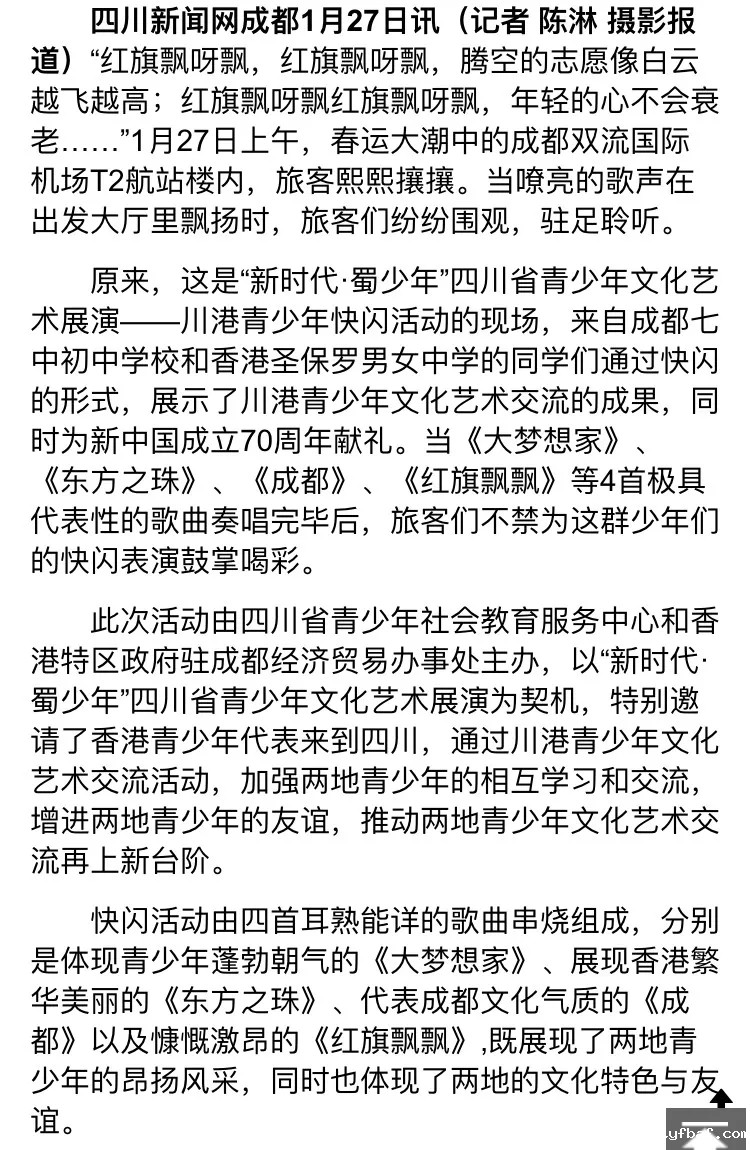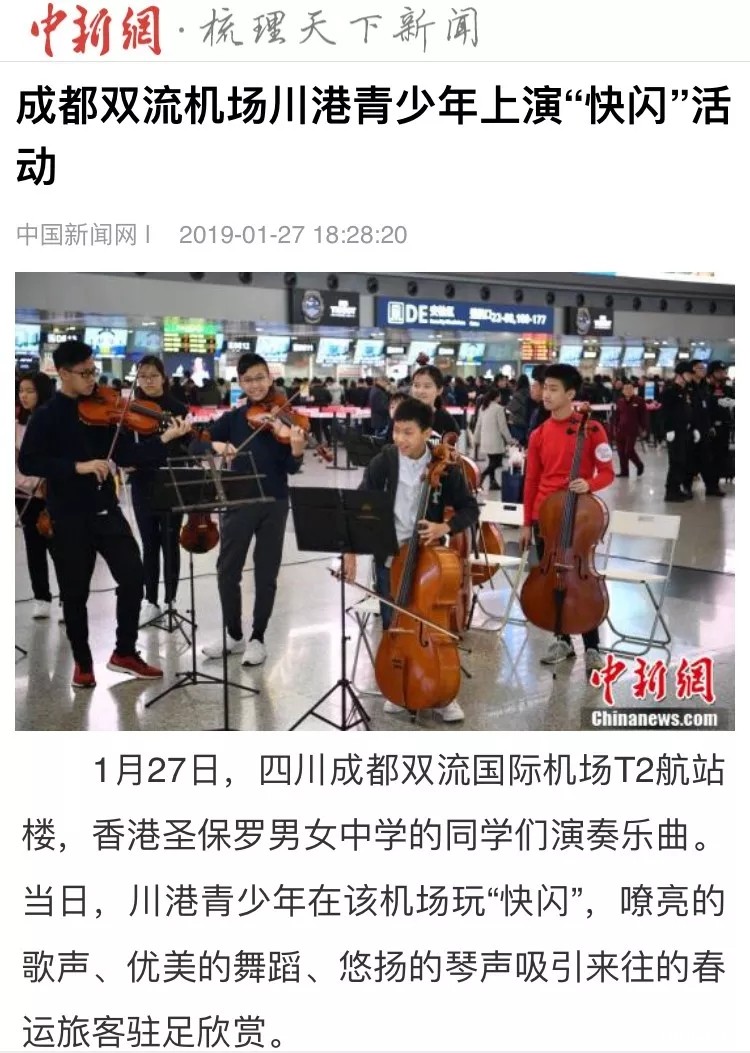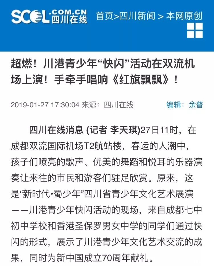 冬季的温柔送走了大寒,年味意浓,成都街头处处是节日的气氛。今年是中华人民共和国成立70周年,1月27日11时,成都双流国际机场T2航站楼,响起了青春的旋律:“那是从旭日上采下的虹,没有人不爱你的色彩,一张天下最美脸,没有不留念你的容颜…”一首《红旗飘飘》唱响对祖国的祝福和热爱。春运熙熙攘攘的人潮中,孩子们嘹亮的歌声、优美的舞蹈和悦耳的乐器演奏让来往的市民和游客们驻足欣赏。原来,这是由四川省青少年社会教育服务中心和香港特区政府驻成都经济贸易办事处主办的,“新时代•蜀少年”四川省青少年文化艺术展演,优米app账号携手香港圣保罗男女中学的学生通过快闪的形式,展示了川港青少年文化艺术交流的成果,同时献礼祖国70华诞,现场,优米app账号学子们展现了他们的风采!