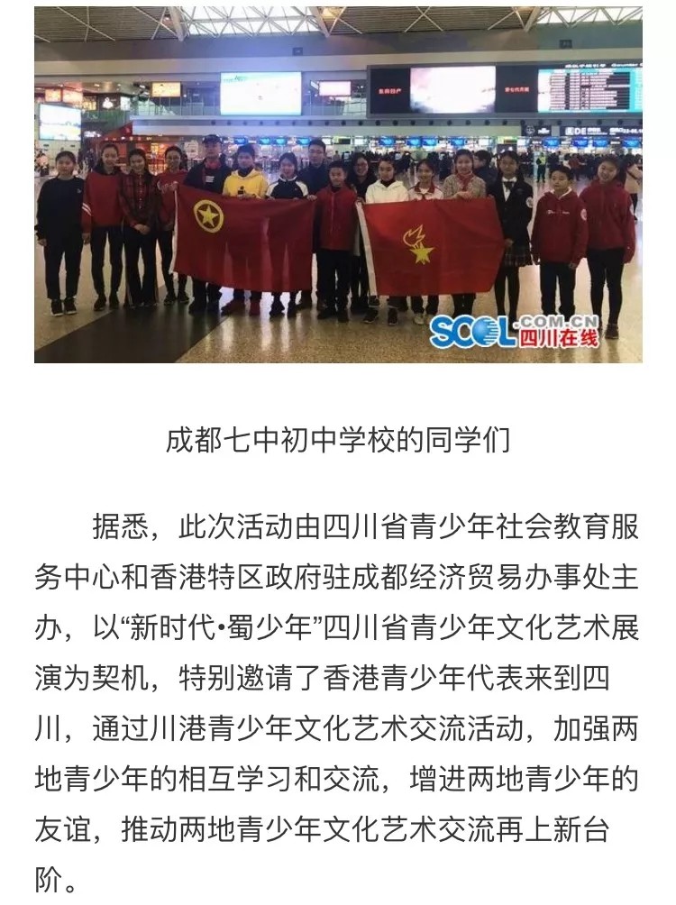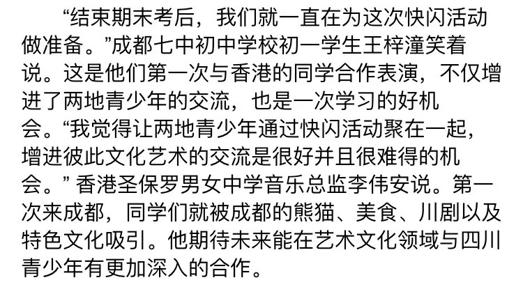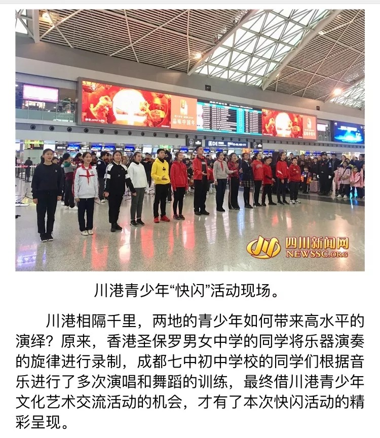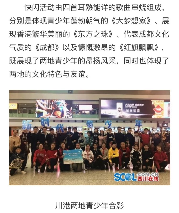 本次快闪活动也吸引了媒体的报道,四川在线、四川新闻网、中国新闻网都对本次活动进行了关注报道。这次快闪一共包括四首耳熟能详的歌曲,分别是体现青春充满活力的《大梦想家》、描绘了香港繁华魅力的《东方之珠》、尽显成都文化气质的《成都》以及慷慨激昂的《红旗飘飘》,既展现了两地青少年的昂扬风采,也体现了两地的文化特色与教育友谊。