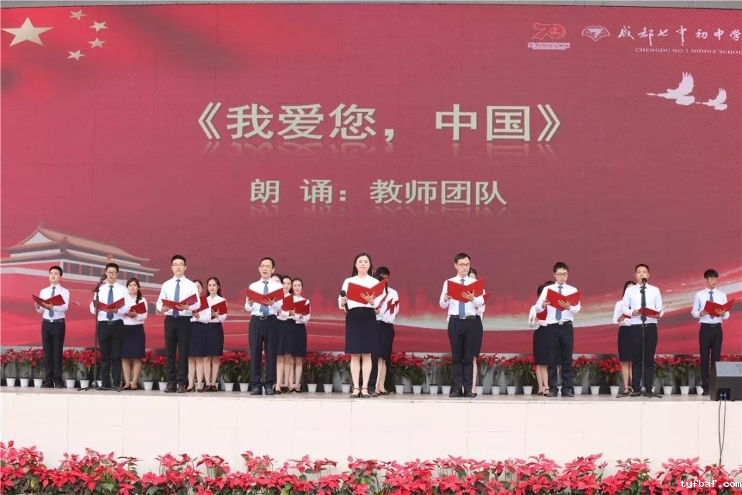 七年级全体师生在何明老师和翁代敏老师的带领下朗诵诗歌《腾飞的中国》。