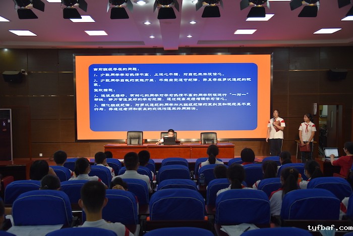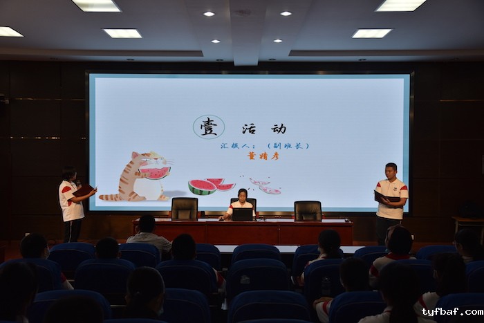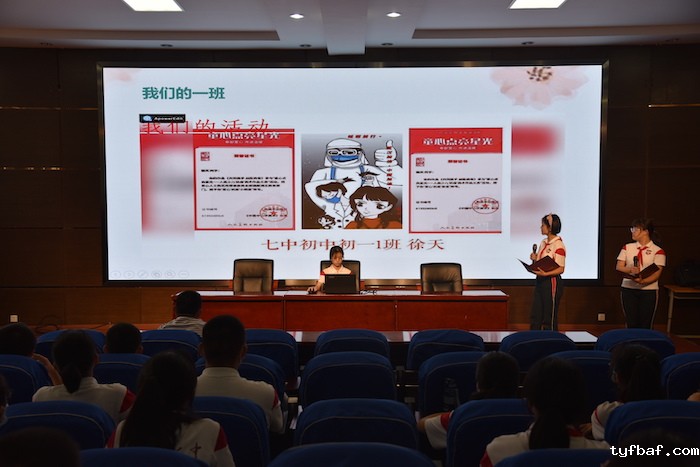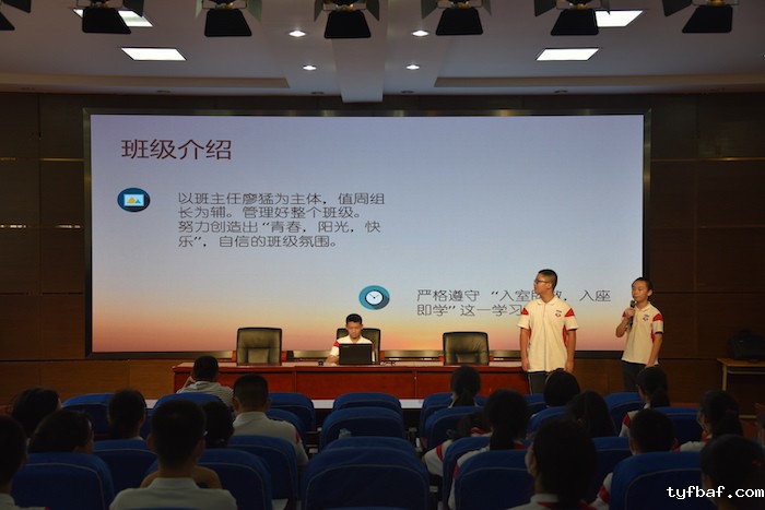 初一一班同学详细介绍了班级管理特色,最有创意的是结束语文字快闪方式的呈现,感恩老师、同学与学校,憧憬初二学习生活的到来。